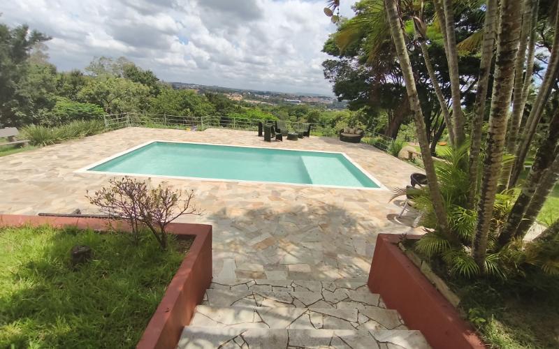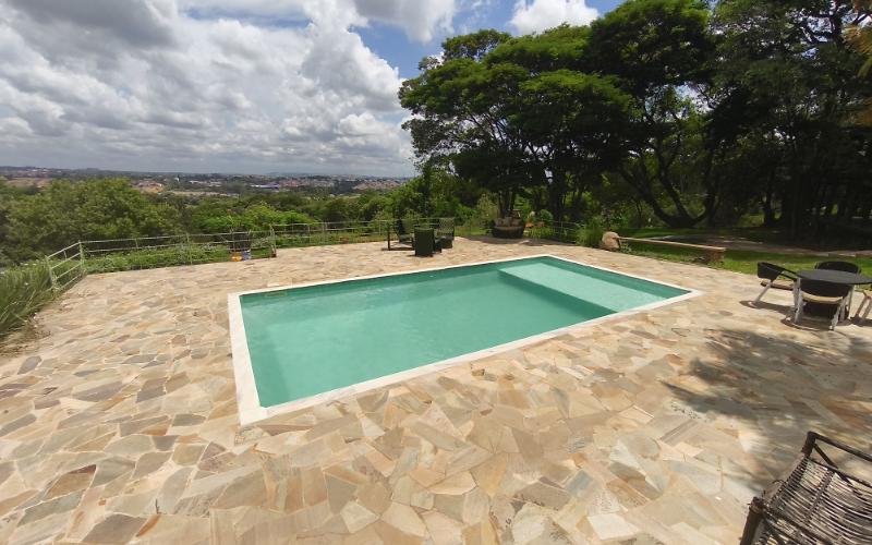 Na área externa, a chácara oferece espaço de churrasqueira em frente à piscina, ideal para encontros ao ar livre. A piscina possui aproximadamente 9 x 4,5 metros, com prainha e área de descanso com poltronas e vista para a paisagem.